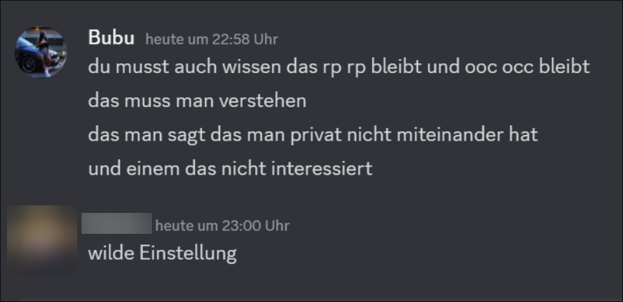 Schön und gut – manchmal müssen Menschen ihre eigenen Erfahrungen machen. In diesem Fall war es jedoch so, dass BFHClanTV ihr während einer IC-Situation Unrecht tat, was sie OOC ebenfalls nicht besonders amüsant fand. Dementsprechend ignorierte sie ihn konsequent, nachdem er seinen Stream beendet, sie geraidet und ihr erneut Aufmerksamkeit geschenkt hatte.