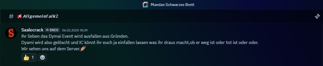 Es ist Februar des Jahres 2025 und wir befinden uns auf dem Discord der Mandanen - und Saalecrack, der Spieler hinter einem Charakter namens Dyami Mapee, sagt, dass ein Event “aus Gründen” ausfallen müsse und der Char gelöscht würde, und dass die Mandanen sich einfallen lassen sollen, was aus dem Charakter wird, woraufhin sich die Mandanen dazu entschieden hatten, den Tod des Charakters auszuspielen. Saalecrack wusste von dieser Entscheidung des Volkes und war mit dieser Entscheidung offensichtlich auch fine.