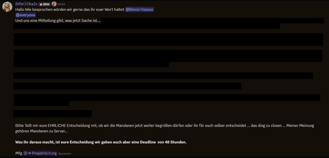 Ein paar Tage nachdem die beiden Mitglieder der Native-Verwaltung das Team verlassen haben, hat die Gruppierung der Mandanen eine “Ansage” im Discord bekommen, was mit der Frage geschlossen wurde, ob die Mandanen nun weiter auf Black Rain Western verbleiben, oder die Mandanen den Server verlassen - inklusive dem Hinweis, dass für Projektleiter ChaZe die Mandanen zum Server gehören würden. Die Mandanen entschieden sich im Übrigen, das Projekt geschlossen zu verlassen, wie Cheve in dem Fraktionsticket dann mitteilte.