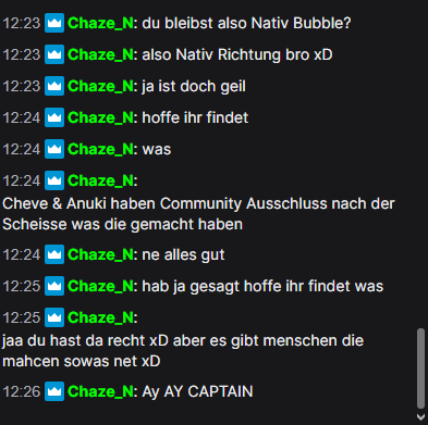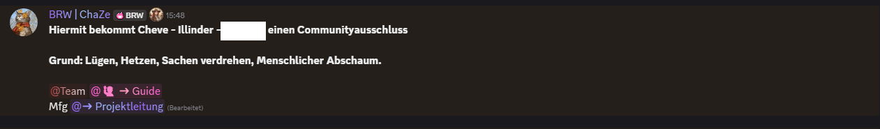 ChaZe verkündete im Discord den Community-Ausschluss von Cheve und Illindar - den beiden Mitgliedern der Native-Verwaltung, die das Team verlassen hatten - und einer weiteren Person, die für diesen Artikel aber keine Rolle spielt. Besonders interessant ist für mich dabei der Umstand, dass er die Personen als “Menschlicher Abschaum” bezeichnet. Was dort zwischenzeitlich noch passiert ist, ist uns nicht bekannt. Mir selbst liegen nur etliche Nachrichten zwischen ChaZe und diesen Personen vor.