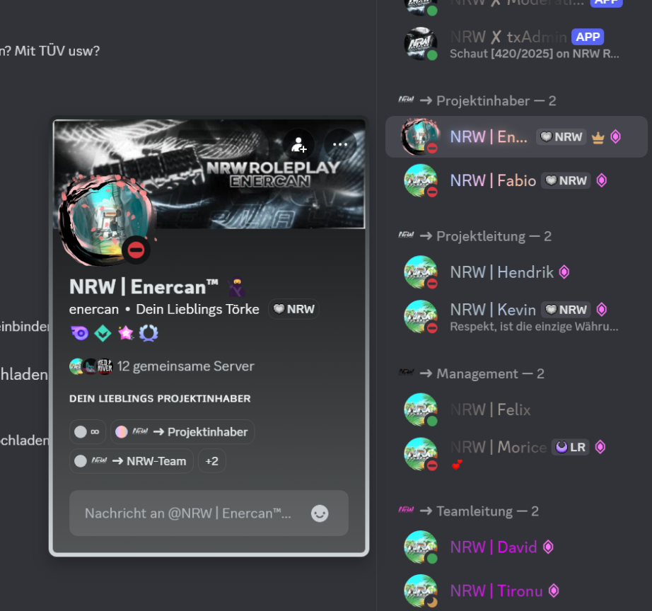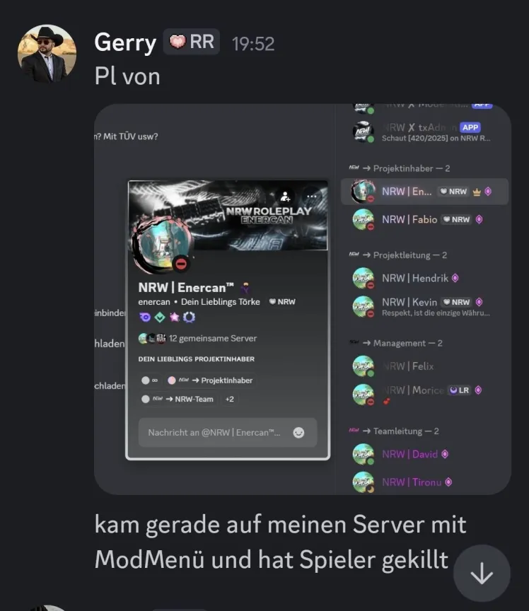 Um das Thema klar und strukturiert anzugehen: Enercan betreibt eine FiveM-Pommesbude und scheint dort als Projektinhaber tätig zu sein, wie es zumindest der aktuelle Stand in der NRW Discord-App zeigt. Als Projektleiter sollte es in seinem Interesse liegen, dass keine unerlaubten Aktivitäten in seiner Pommesbude stattfinden. Doch was außerhalb seiner Pommesbude geschieht, scheint ihn nicht weiter zu kümmern. Schauen wir uns nun die vorgelegten Beweise an.