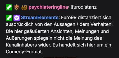 Wie in den Clips zu sehen war, streamt Furo99 AktRP für seine Zuschauer und kriegt sogar Subs, um dieses Akt RP zu spielen. Um zu sagen, dass das alles nicht real sei bzw. der Streamer selber eigentlich gar nicht so ist und sowas nicht unterstützt, hatte dieser einen Command erstellt, welchen die Mods regelmäßig auslösen sollen.