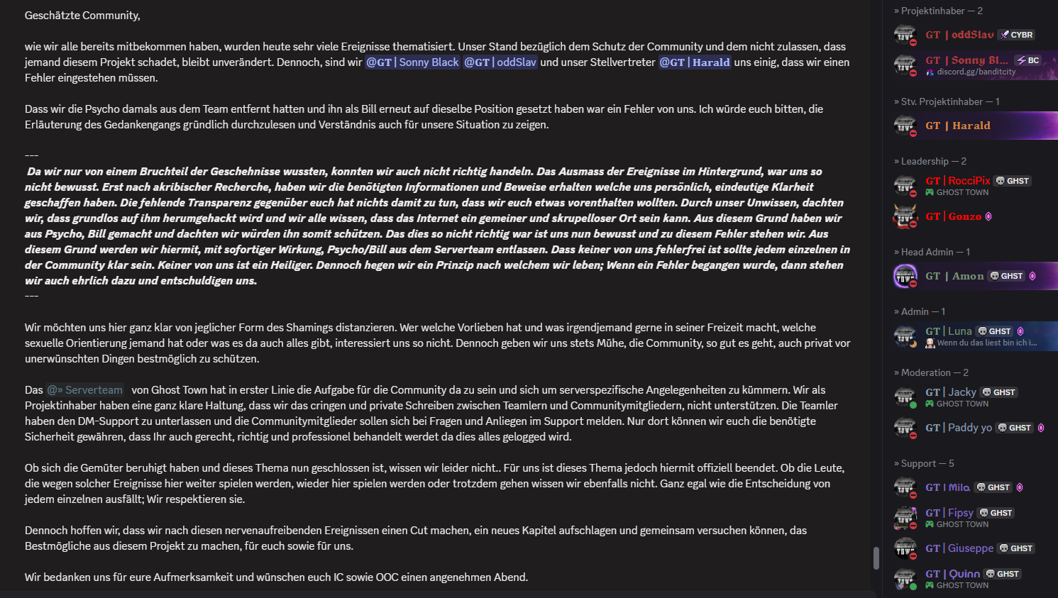 Das zeigte sich vorallem, weil ein User aus unserer Community "psycho" anschrieb und ihn damit konfrontierte, woraufhin der Spieler vom Projekt Ghost Town gebannt worden ist.