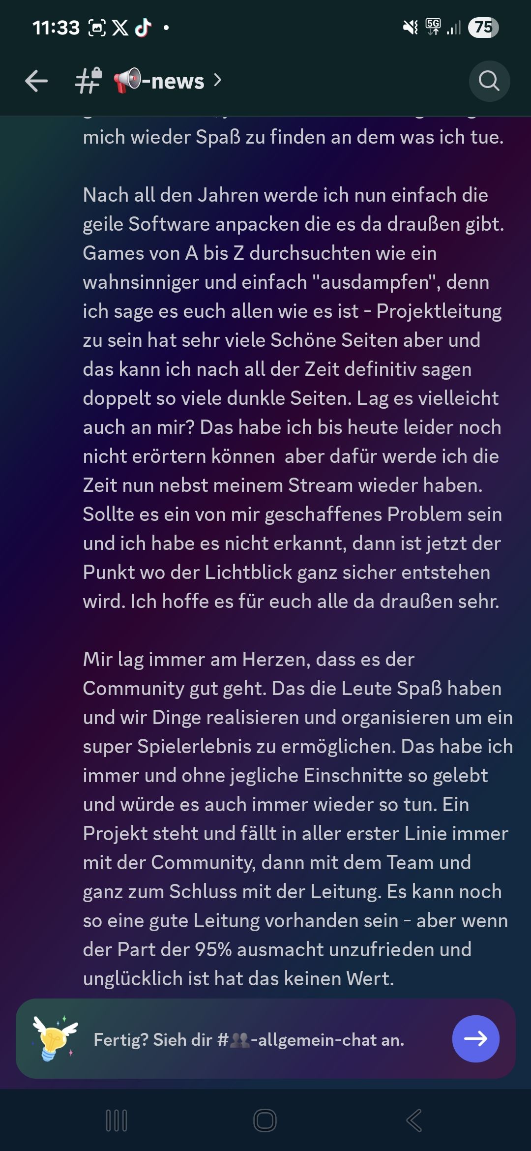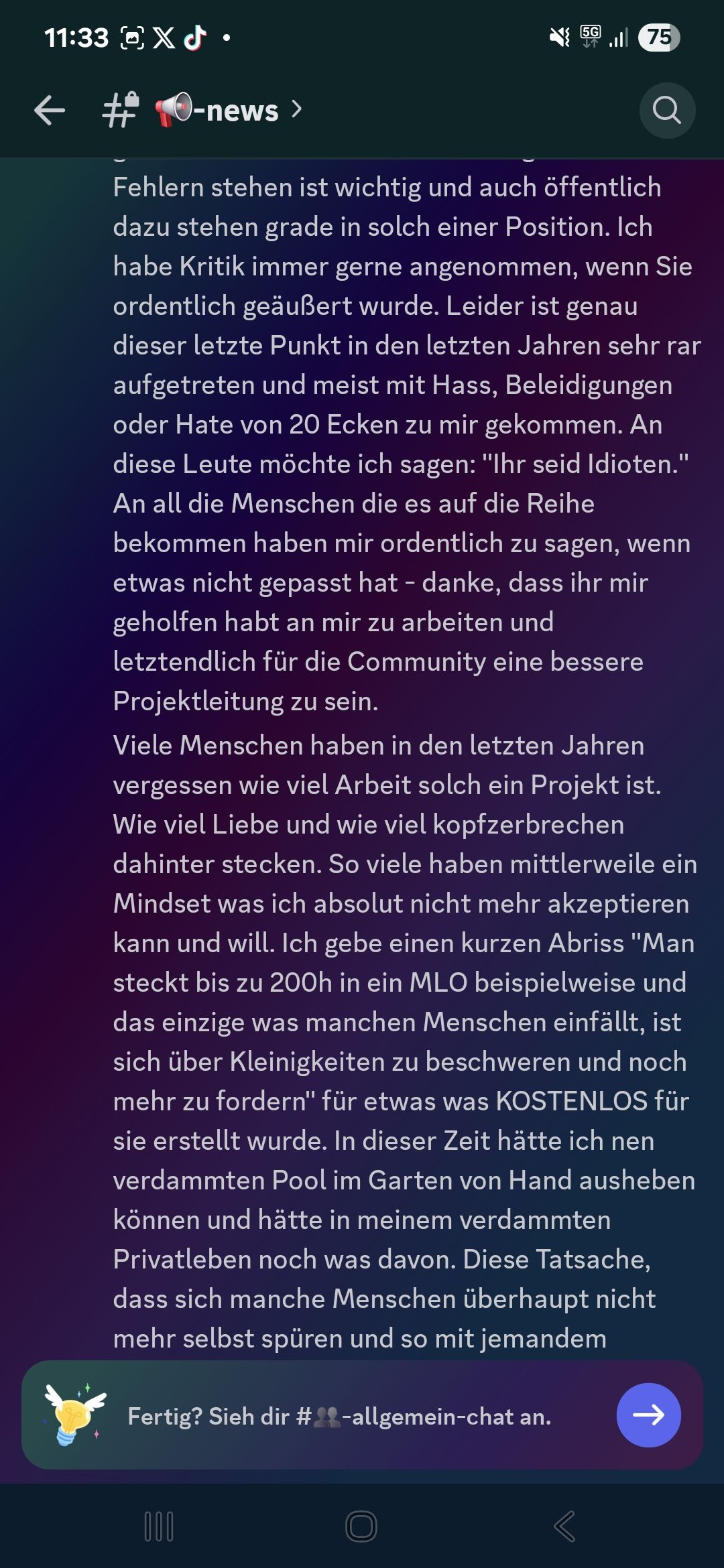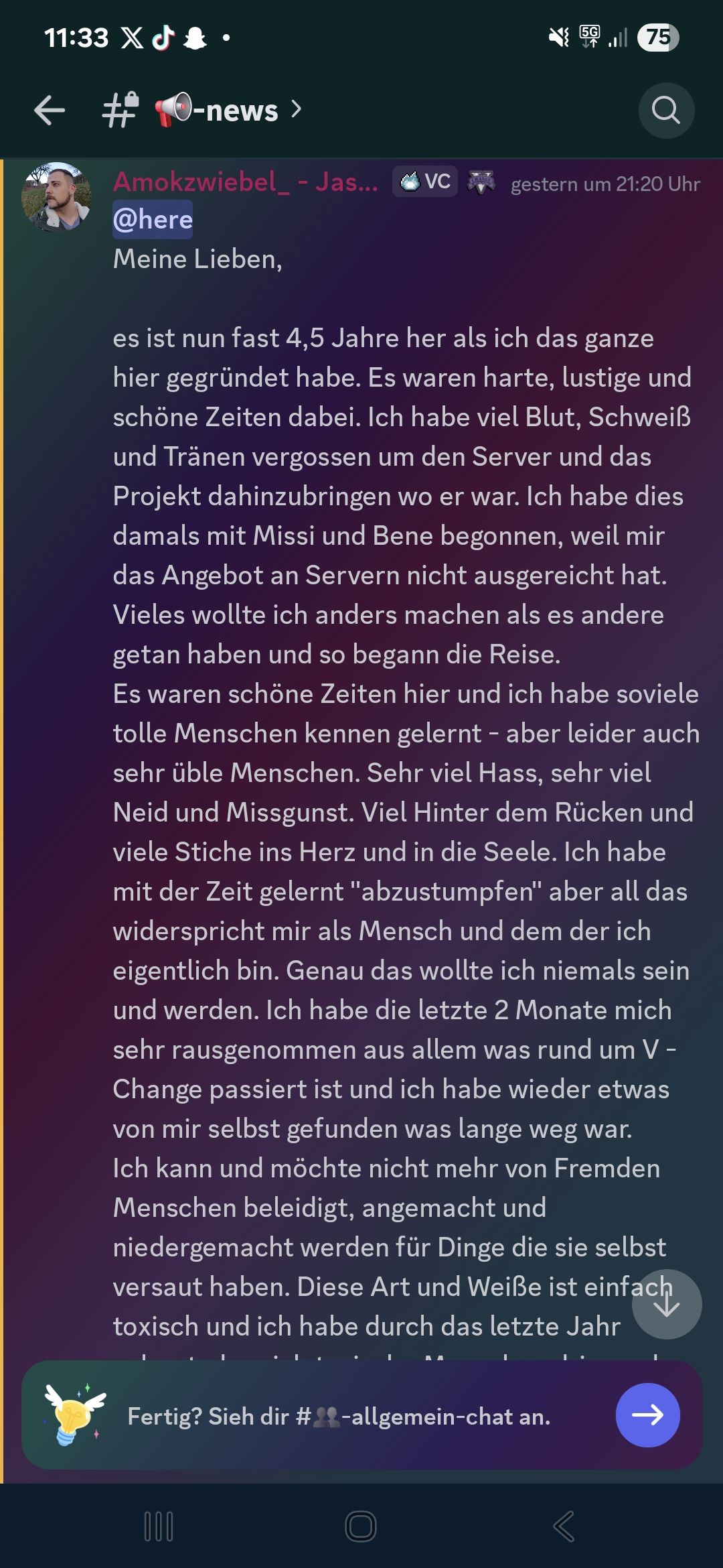 Heute geht es um einen Ausschnitt aus dem V-Change Discord. In diesem hat Amokzwiebel, die Projektleitung von V-Change, einen Text verfasst, in dem er sich verabschiedet als Projektleitung. Das Projekt soll er laut Text an Liam gegeben haben.