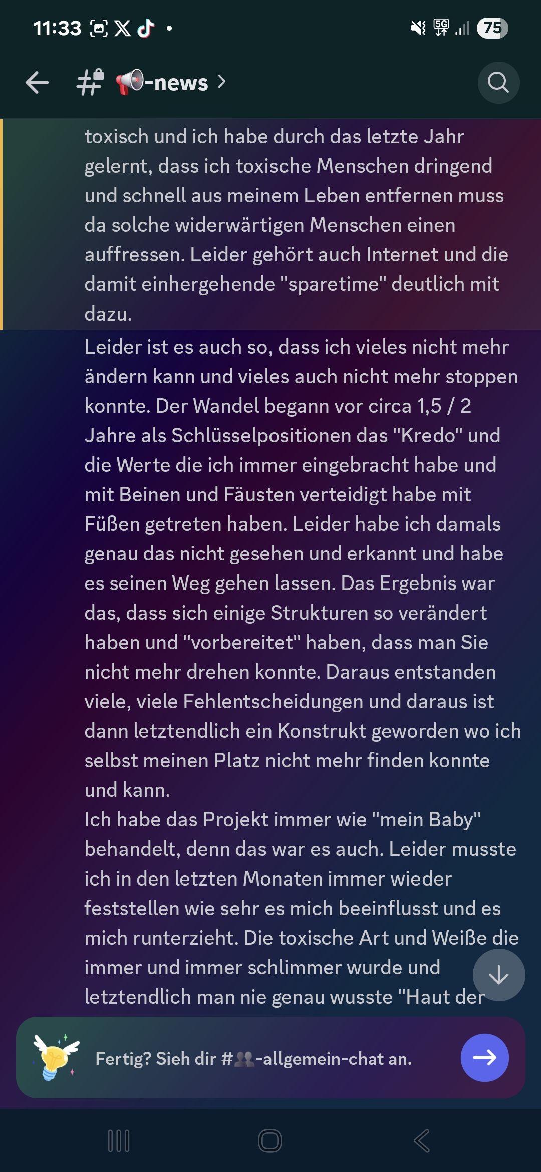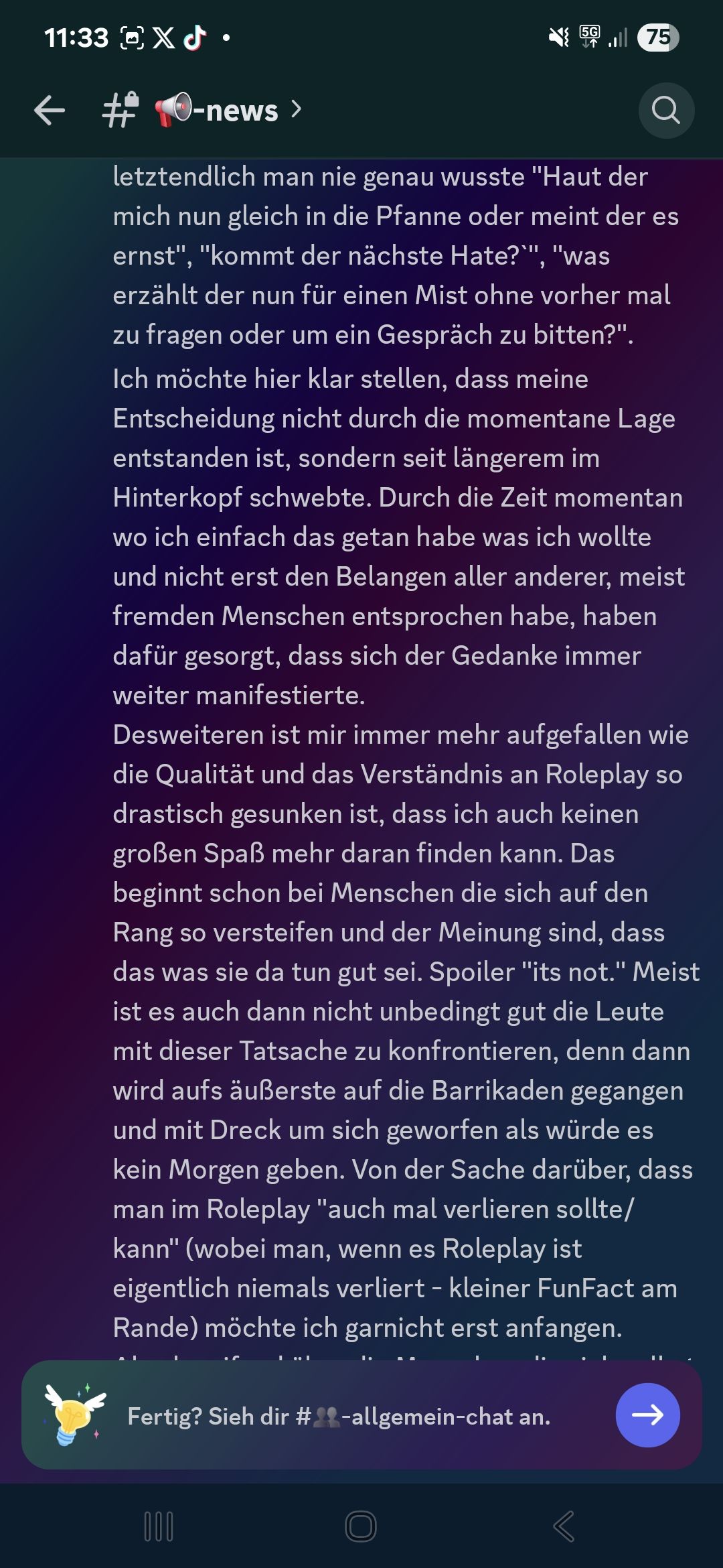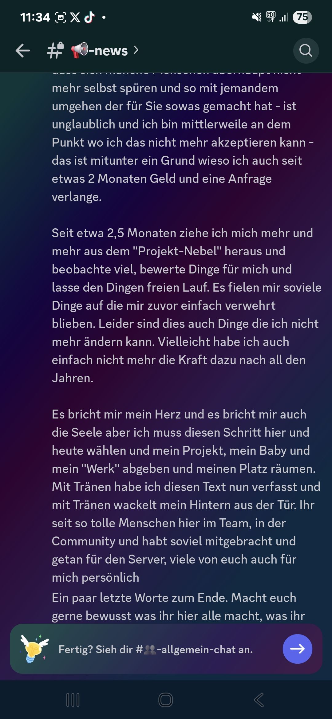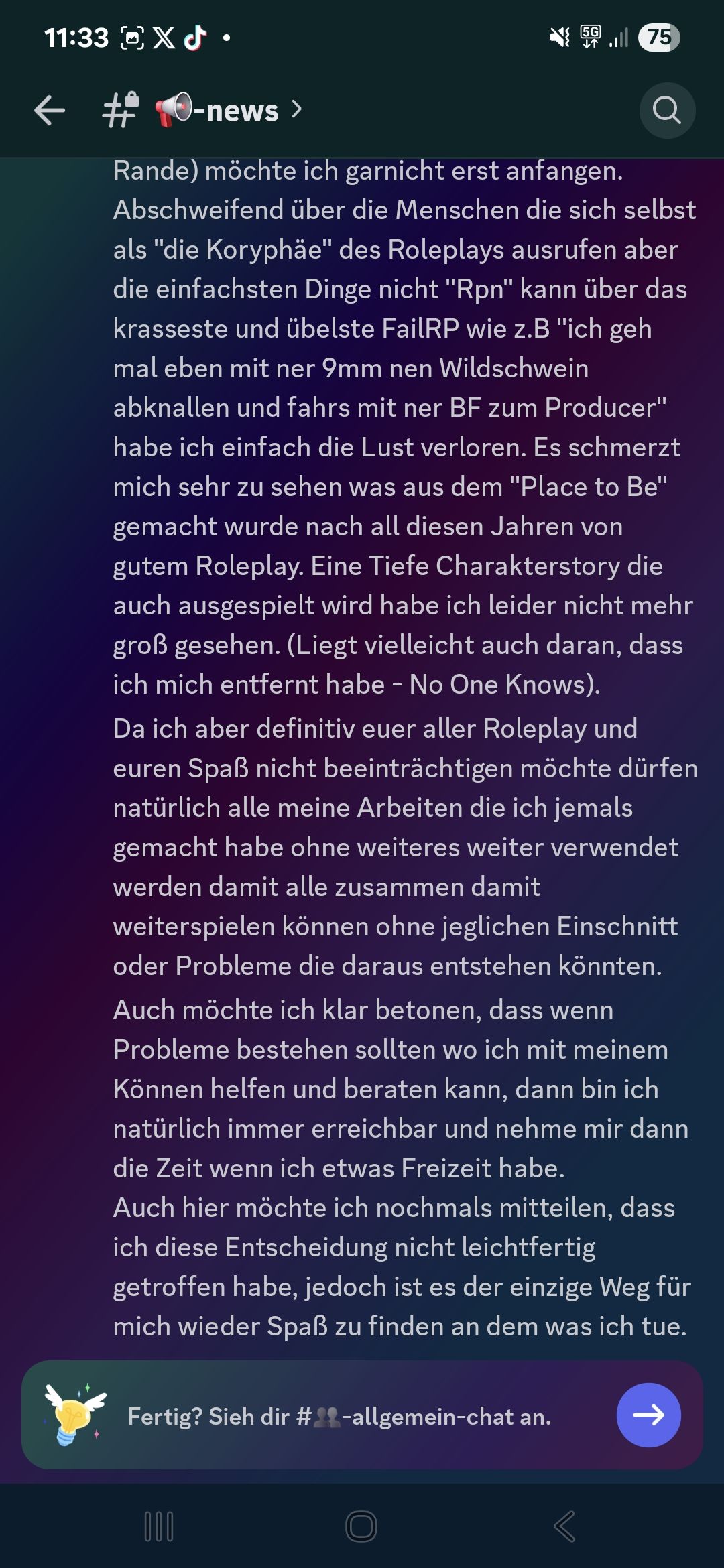 Heute geht es um einen Ausschnitt aus dem V-Change Discord. In diesem hat Amokzwiebel, die Projektleitung von V-Change, einen Text verfasst, in dem er sich verabschiedet als Projektleitung. Das Projekt soll er laut Text an Liam gegeben haben.