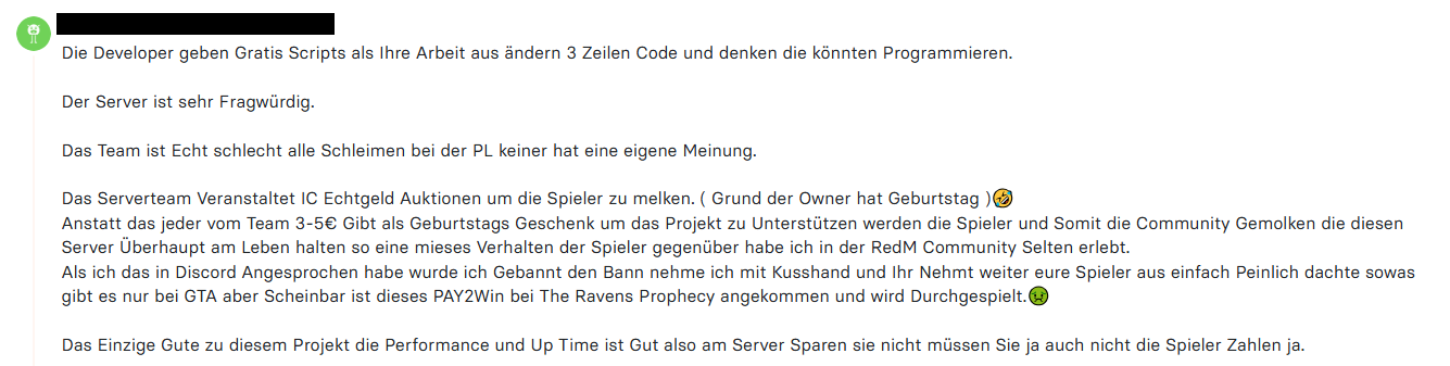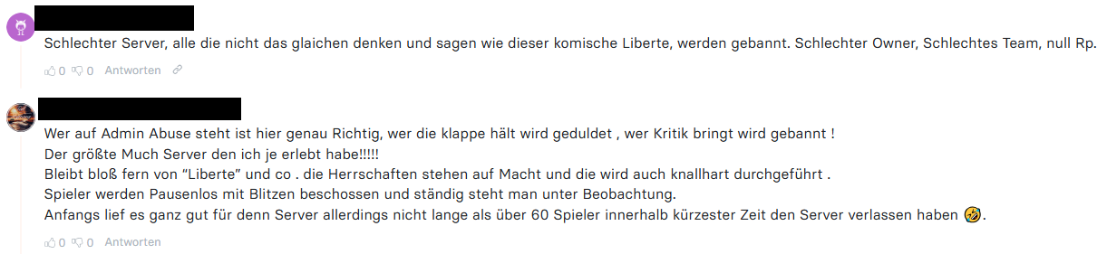 Doch es bleibt nicht nur bei solchen fragwürdigen Echtgeld-Verkäufen bei dem Server. Mehrere Nutzer geben auch an, dass das Serverteam nur Personen auf dem Projekt dulden würde, die keine Kritik an diesen Machenschaften üben würden - und dass dieses Verhalten vom Serverteam bereits zu starken Abwanderungen vom Server führten: