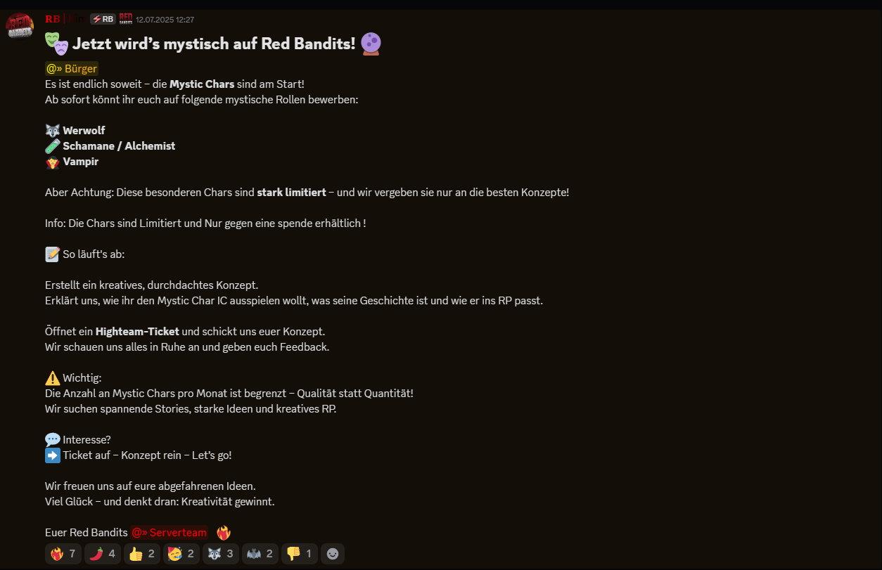 Am 12.07.2025 gab es in der Discord App vom Server, schon die erste Ankündigung für Mystic Chars. In dieser Ankündigung wurde alles aufgeführt, was man tun muss, um einen Mystic Char bespielen zu dürfen.