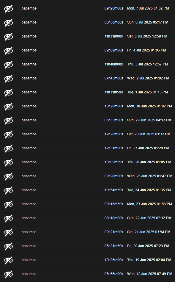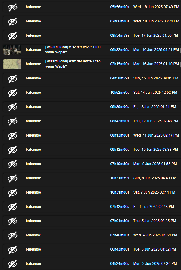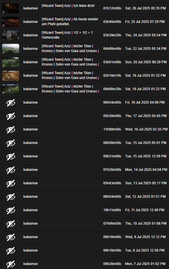 Und auch wenn BabaMoe mehrfach in seinem Stream sagte, dass ihn das Ganze ja gar nicht jucken würde, und dass das ganze Fake gewesen wäre, hat er fast seinen gesamten Stream an diesem Tag diesem Beitrag gewidmet. Und danach? Obwohl es ihm so egal war, sieht man einen deutlichen Bruch in seiner Streaming-Aktivität - seit einer Woche gar kein Stream mehr, obwohl seine fast täglichen Streams in der Länge eines gewöhnlichen Arbeitstages seit Ende Mai noch in Twitch VODs gespeichert sind - wenn auch zu einem Teil unveröffentlicht.