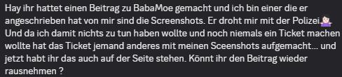 Sie betont hier klar, dass die Screenshots von ihr sind und dass sie diese nicht bei uns eingereicht hat und bittet den Beitrag von der Seite zu nehmen. Sie betont hierbei auch, dass BabaMoe ihr mit der Polizei drohen würde. Aus verschiedensten Stellen kann ich sowohl bestätigen, dass dieses Ticket von der Geschädigten eröffnet wurde, und dass BabaMoe tatsächlich mit Anzeigen droht - gegen die Person und natürlich gegen uns.