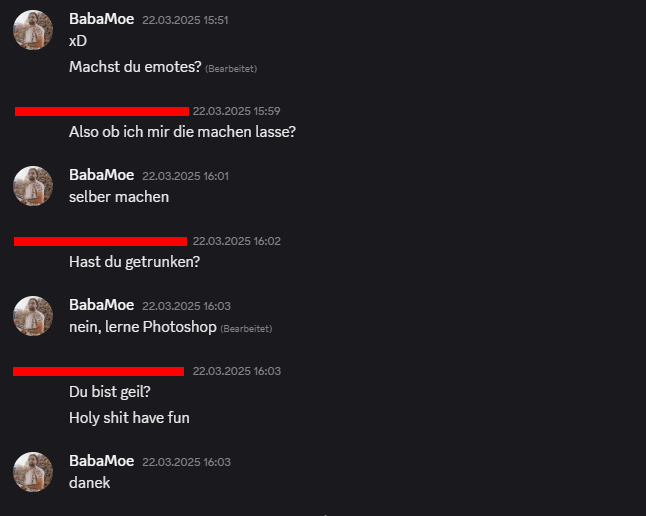Freundlich wie ich bin, habe ich BabaMoe darauf hingewiesen, dass er selbstverständlich die Möglichkeit hat, etwaige Gegenbeweise einzureichen, damit es korrigiert wird, wenn es Fake ist - zu dem Zeitpunkt wusste ich nicht, dass er sich bereits seit Anfang Februar auf unserem Discord befindet. Seine Reaktion darauf?