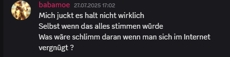 Was wäre schlimm daran, wenn man im Internet Frauen sexuell belästigt, diese bedrängt und bedroht - oder wie BabaMoe es nennt: „sich vergnügt“. Für mich hat BabaMoe damit genug bewiesen, was Phase ist - und genug von seinem „Charakter“ gezeigt.