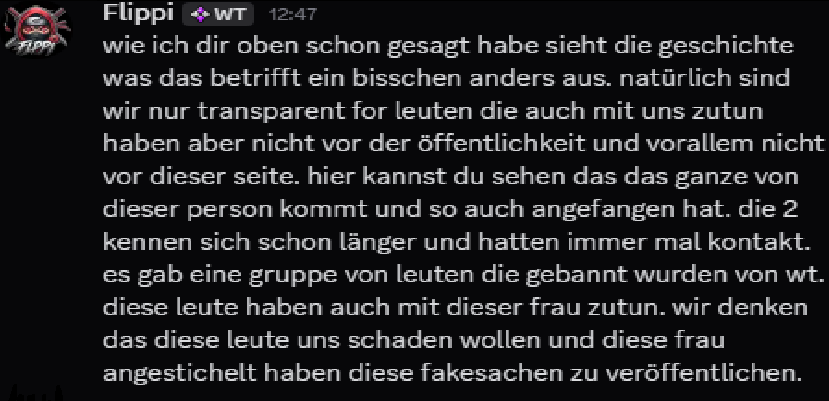 Also mit anderen Worten: Flippi versucht zu verkaufen, dass die Geschichte ganz anders gewesen wäre, dass das alles natürlich von ihr ausgegangen ist, dass die beiden sich schon länger kennen würden und dass sie das nur machen würde, um dem Server zu schaden und dass das alles natürlich Fake wäre.
