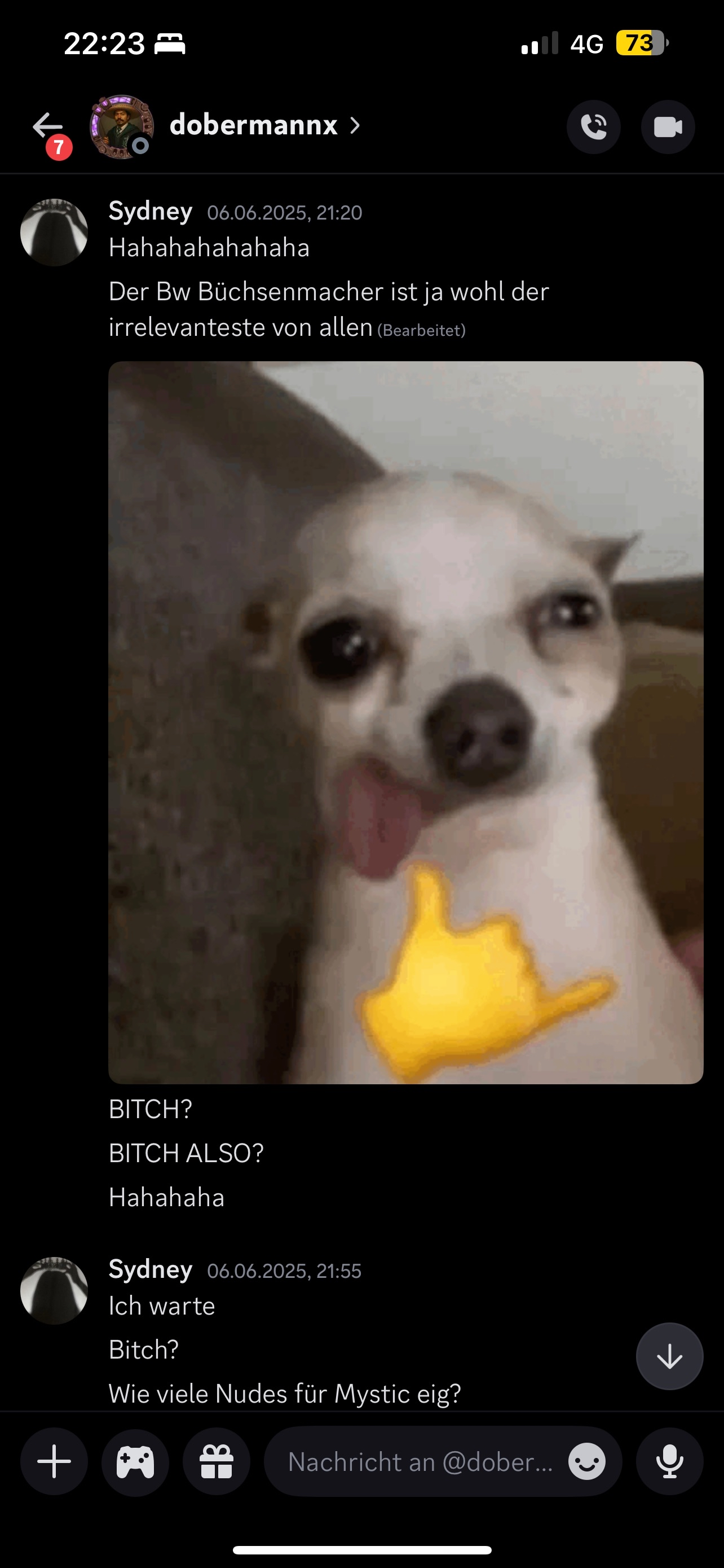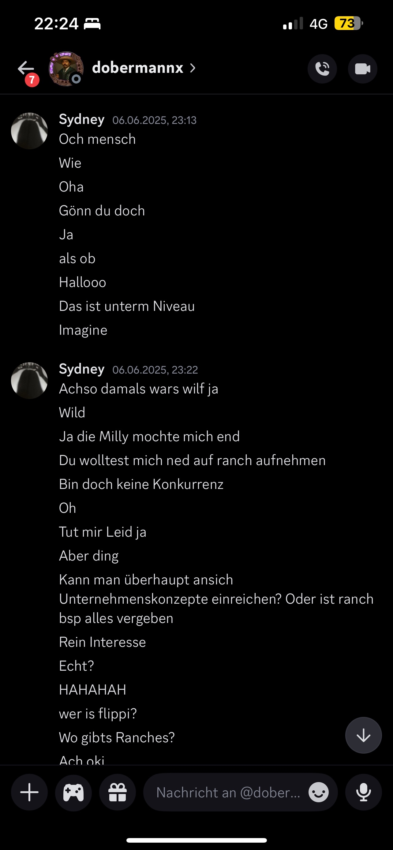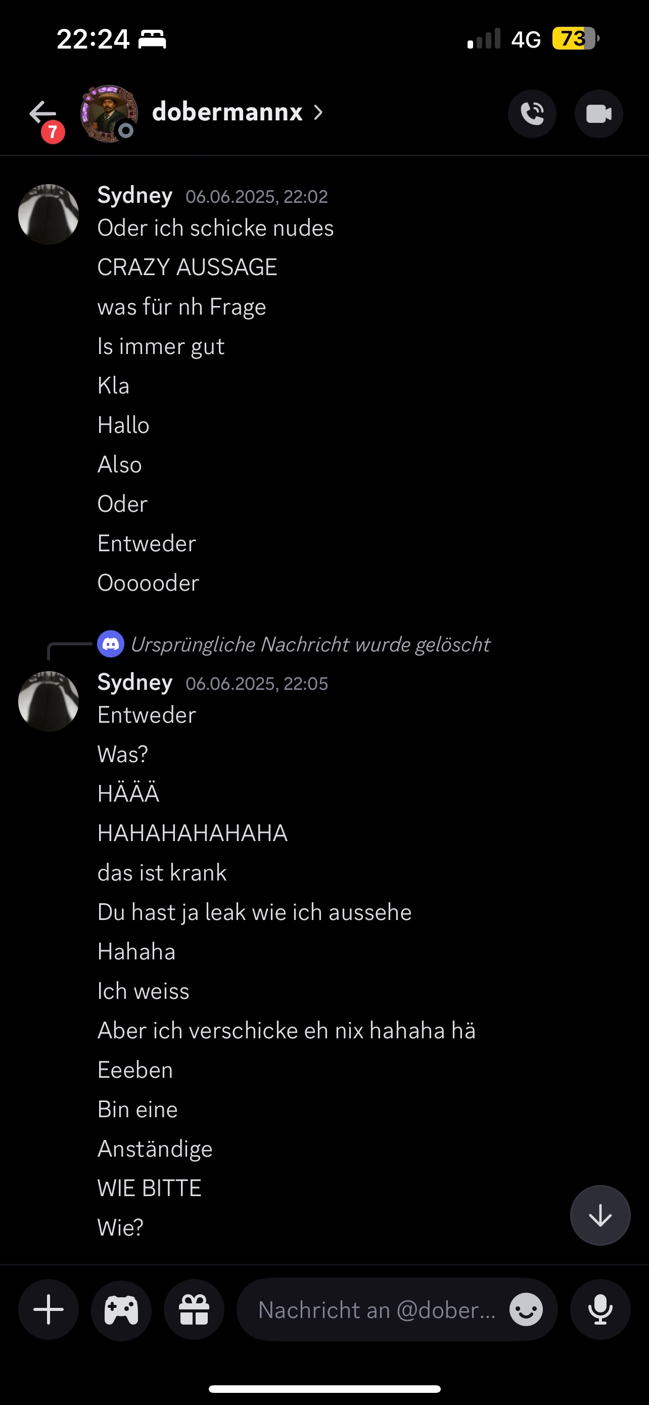 Stellen wir uns einfach mal für einen Moment vor, dass es den gesamten Kontext gar nicht gäbe, und dass Sydney das alles nur macht, um dem Projekt zu schaden… dann existieren dennoch diese Chats, in denen Projektleiter dobermannx solche Nachrichten an Spielerinnen seines Servers verschickt, in denen er fast schon penetrant auf Nudes von ihr besteht, selbst nachdem sie schon sagte, dass sie das nicht machen wird - und das Verhalten hat in keinem geschäftlichen Kontext etwas mit Seriosität zu tun - und würde bei einem Ladenbesitzer schnell zu einer Anzeige wegen sexueller Belästigung führen.