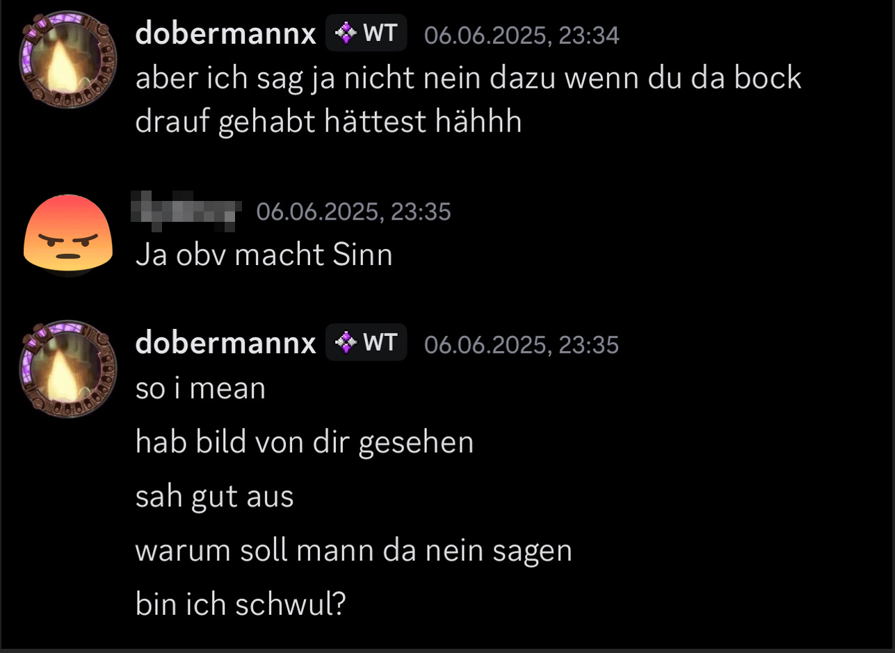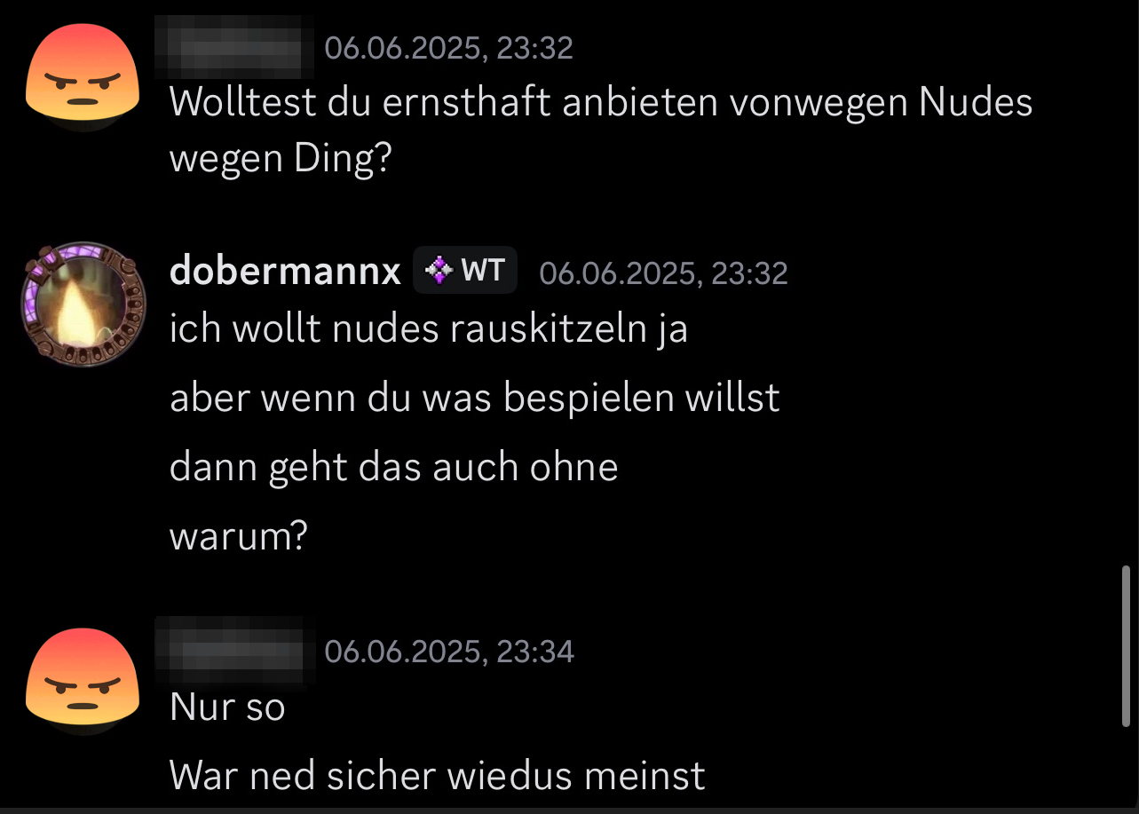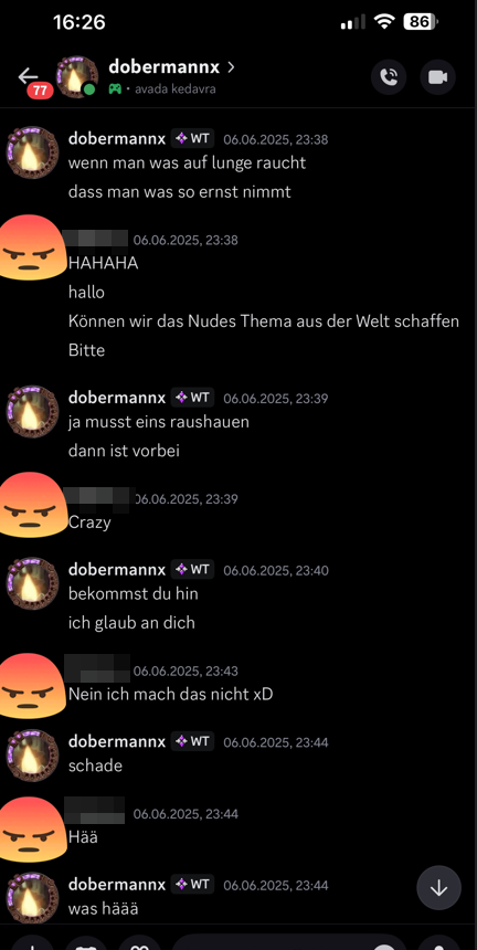 Nicht nur ist in den Chats zu lesen, das El Nacho, auch dobermannx genannt, Nacktfotos von der Userin fordert, nein, er ermutigt sie sogar mehrmalig dazu, welche zu erstellen. Außerdem ist raus zu lesen, dass das der Spielerin sichtlich unangenehm ist und diese das Thema „aus der Welt“ schaffen möchte. Trotzdem ermutigt daraufhin El Nacho noch einmal die Spielerin, ein Nacktfoto zu erstellen und ihm zu senden.
